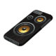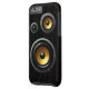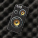 This fun speaker design features woofer, tweeter and bass speakers on a wood grain background, taking you back to the look of speakers in the 80s when we all had cabinet speakers.