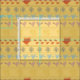 Retro yellow background and colorful pattern of birds, dots, footsteps, flowers, hearts, butterflies.