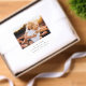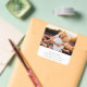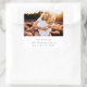 A stylish 3-inch square photo return address label bulk roll featuring classic typography on a clean minimalist white background. This elegant and modern design can be personalized with your own photo, name, and greeting for a unique and polished touch. Perfect for the holiday season, weddings, or any special occasion, it offers a timeless look that adds warmth and sophistication to your mail. The sample image shown is for illustration only and can be replaced with your own personal photo. Shown here with a happy couple wearing white T-shirts at sunset with a heather backdrop, this design captures simplicity and love in a natural, modern way. A beautiful choice for both festive and everyday correspondence.