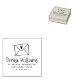 Return address rubber stamp with your name in a fun, whimsical font and a letter with a heart