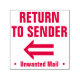 This rubber stamp design features the messages "RETURN TO SENDER" and "⬩ Unwanted Mail ⬩", along with a decorative arrow symbol. It could be used to indicate that received mail has been delivered to the wrong address, and should be returned to the sender.