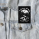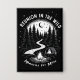 A black and white illustration featuring a camping scene with a tent, trees, a fire, and the text "REUNION IN THE WILD" and "Memories for Miles."