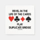 Duplicate bridge players will enjoy this bridge saying paper napkins featuring the four card suits along with the truism saying "Revel In The Life Of The Cards Play Duplicate Bridge". Sound bridge advice for all avid duplicate bridge players who think nothing but the life of the cards! Memorable customizable paper napkins for those who enjoy the game of duplicate bridge.