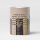 This pillar candle showcases an architype aubette print font with tan letters black outline displaying the "Revelation 1:3" KJV bible scripture verse over a picture featuring a set of bibles of different colors in the background in this biblical faith based theme. This verse is referencing the Book Of Revelation 1st chapter showing the 3rd verse in this bible scripture quote theme from the King James bible. The candle is covered with a beautiful full-color wrap hand poured, individually designed made with high grade American paraffin & beeswax and, burns approximately 40 hours made in the USA.