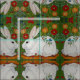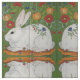 My original, copyrighted white rabbit ceramic tile mural has a green background and bright flowers, and is intriguingly recreated on this fabric.