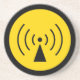 Sandstone coaster with a yellow and black radio frequency warning symbol.
