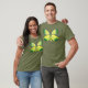 My 11 yo wore adult XL (5’7” 165#). The 8yo is small framed. She wore adult small and tied it in the back. Grandma wore adult large with long sleeve shirt underneath. Tall girl adult medium. Dark haired male adult large. Good quality dark Heather gray, Gildan brand shirt. -it was next up from basic choice and cost about $20 per shirt. Not too thick or thin. Washed and dried well, no major shrinkage. Not see-through. Can wear a bra under it fine. Screen print is just as shown and well done, front and back.