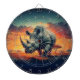 A majestic rhinoceros stands tall against a vibrant sunset, its form composed of intricate geometric shapes. The African savanna stretches out behind it, dotted with acacia trees.