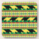 Black and yellow rhinos march across green stripes alternating with loosely “woven” stripes in African colors of red, black and green with yellow accents.