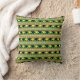 Black and yellow rhinos march across green stripes alternating with loosely “woven” stripes in African colors of red, black and green with yellow accents on this graphic patterned throw pillow.