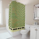 This wildlife themed shower curtain is embellished with a pattern of black and yellow rhinos marching across green stripes alternating with loosely put together stripes in African inspired hues of red, black and green with yellow accents and a row of rhinoceros silhouettes along the bottom.