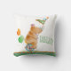 Cute whimsical watercolor animal rhino kids / baby nursery cushion pillow. Add your own name for a cute personalized new baby or baby shower gift, currently, reads Riley, add your own initial to the flag too. Soft watercolor brown rhinoceros on a unicycle circus art with fall/autumn shades of brown, green, orange, purple and aqua. Unique whimsical animal watercolor art painting and design by Sarah Trett. www.sarahtrett.com for www.mylittleeden.com
