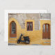 A black scooter against a yellow wall in Rhodes Town, Greece