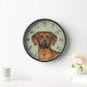 Destei's original cartoon illustration of a cute Rhodesian Ridgeback breed dog's head. The background color is green with a decorative texture. The texture can be removed and the background color can be changed to any other color, if so wished. The hours are marked with numbers. The hours and minutes are shown with a dotted clock face.
