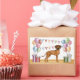Destei's original cartoon illustration of a cute Rhodesian Ridgeback breed dog. The dog is placed in a colorful birthday setting with pastel color birthday balloons, gifts and a bunting banner. The pastel colors include pink, green, blue, red, orange and purple. The dog is standing on a yellow wood floor texture and the background has a playful pastel color polka dot pattern.