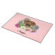 Destei's original cartoon illustration of an adorable Rhodesian Ridgeback breed dog's head close-up surrounded by colorful summer wildflowers. There is a blush pink flower, a purple flower, a dark pink flower and a white daisy flower together with some green leaves and branches. The background color is pink with a light polka dot pattern. The background color can be changed to any other color and the polka dot pattern can be removed, if so wished. There is also a personalizable text area for a name or other custom text.