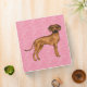 Destei's original cartoon illustration of a cute Rhodesian Ridgeback breed dog on a pink background color with a pattern of hearts in different sizes. There is also a personalizable text area on the spine together with a black dog paw print silhouette.