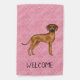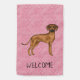 Destei's original cartoon illustration of an adorable Rhodesian Ridgeback breed dog on a pink background color with a pattern of hearts in different sizes. There is also a personalizable text area that now reads: "Welcome".