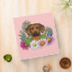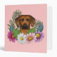 Destei's original cartoon illustration of an adorable Rhodesian Ridgeback breed dog's head close-up surrounded by colorful summer wildflowers. There is a blush pink flower, a purple flower, a dark pink flower and a white daisy flower together with some green leaves and branches. The background color is pink with a light polka dot pattern. The background color can be changed to any other color and the polka dot pattern can be removed, if so wished. There is also a personalizable text area on the spine.
