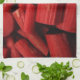 This kitchen towel features closeup fine art photography of rhubarb stalks (Rheum rhabarbarum) cut up and ready for pie or sauce. The arrangement of pieces and lovely red color create an interesting abstract pattern. Sometimes considered a fruit and sometimes a vegetable, this herbaceous perennial is one of the first spring edibles in the garden. The roots are used in traditional Chinese medicine.