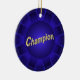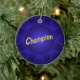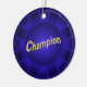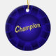 This ornament is decorated on one side with a blue ribbon rosette bearing the word "Champion" in gold colored lettering and on the reverse with easy to customize text.