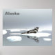 A digital painting of a brown and white Ribbon Seal resting on an ice floe on a very gray and dreary day. Text reading "Alaska" also appears. The ribbon seal (Histriophoca fasciata) is a medium-sized pinniped from the true seal family (Phocidae). They are among the most striking and easily recognizable. They can be identified by the distinctive light-colored bands or “ribbons” that encircle their neck, each foreflipper, and hips. The contrast is particularly strong with the males,having a dark brown to black pelage with white ribbons, females range from silvery-grey to dark brown with paler ribbons. Newborn ribbon seal pups have white natal fur. After moulting their natal fur, their color changes to blue-grey on their backs and silvery beneath; after some years some portions become darker and others brighter, and only at the age of four years does the typical design show. Ribbon seals molt their coat of hair annually, beginning in May and finishing in July, with younger individuals molting earliest. The ribbon seal has a large inflatable air sac that is connected to the trachea and extends on the right side over the ribs. It may function as a buoyancy device, for air storage during diving, or for "phonation." It is larger in males than in females. The ribbon seal can grow to about 5.2 ft long and weigh up to209 lb in both sexes. Ribbon seals alternate their foreflippers and swing their hindquarters to run across ice, rather than using the caterpillar-like movement typically used by most seals. Ribbon seals are also physiologically and anatomically adapted to make deeper dives (up to about 1950 ft (600 m)) and swim faster than other seals. They have an air sac that Ribbon seals are a seasonally ice-bound species found in the Arctic and Subarctic regions of the North Pacific Ocean, notably in the Bering Sea and Sea of Okhotsk, and adjacent parts of the Arctic Ocean, including the Chukchi Sea, eastern Siberian Sea, and western Beaufort Sea. These seals are relatively solitary, spending most of their time in the open ocean and forming loose aggregations in the pack ice during spring to give birth, nurse pups, and molt. They are very rarely seen on shorefast ice or land. This species seems to prefer moderately thick, “clean” ice floes found in the inner zone of the ice front. From late-March to early-May, ribbon seals in the Bering Sea range from the Pribilof Islands to Gulf of Anadyr, roughly along the continental shelf break, being more abundant in the northwestern ice front. As the ice recedes during May to mid-July, the seals move farther to the north where they haul out on the receding ice edge and remnant ice, occasionally in dense groups. After the ice has melted, most ribbon seals probably either migrate with the receding sea ice through the Bering Straight into the Chukchi Sea or remain pelagic in the Bering Sea during the rest of the year. Thus far, there have been only two acknowledged instances where ribbon seals have been found as far south as Seattle, Washington and even further south at Morro Bay, California. There was nothing to suggest that illness was the cause of either seals appearance at either place, as both appeared to be healthy. Ribbon seal mothers give birth to their pups far offshore in the pack ice during April to early-May. The pups double their weight during nursing and are weaned after three to four weeks. Mating likely occurs shortly after weaning, though little is known of the breeding system. Ribbon seals are known to eat a variety of fishes, cephalopods, and crustaceans; however, information about their feeding habits is limited and mostly restricted to the spring when ribbon seals are typically feeding less, as evidenced by their decreased weight and blubber thickness. Although there is little direct evidence of predation, potential predators of ribbon seals include polar bears, killer whales, sharks, and walruses. Ribbon seals are relatively unwary while hauled out and can be approached closely by boat. This behavior suggests that ribbon seals probably do not experience much predation by polar bears, but may also make them especially susceptible to hunting by man. Siberia and Alaska Natives have hunted the ribbon seal for many generations for subsistence, and the current annual take by Alaska Natives is estimated to be less than 200 seals per year. Commercial harvests of ribbon seals were conducted by Soviet sealers in the 1960s to 1980s, during which time the Bering Sea population is thought to have declined from 80,000 or 90,000 animals to 60,000. Surveys during the early and mid-1970s put the worldwide population estimate of ribbon seals between 200,000 and 240,000, with estimates ranging between 60,000 and 100,000 in the Bering Sea. A more recent and reliable abundance estimate is not currently available. Predators of the ribbon seal include orca, the Greenland shark and polar bears. In the 1960s, the population of ribbon seals in the Bering Sea was reduced from about 120,000 to 70,000. The population size increased back to about 130,000 in 1987 after quotas were set to limit harvest to about a fourth of the number of seals hunted previously. In the latest stock assessment (2007), the National Marine Fisheries Service estimated a global population size of 240,000 ribbon seals, 90,000-100,000 of which inhabit the Bering Sea. In the Okhotsk Sea, the average number of ribbon seals was 370,000 between 1968 and 1988. The current population trend is unknown, but recent estimates suggest that no catastrophic declines have occurred in recent decades. Humans have hunted ribbon seals for generations and are still hunted today by Siberia and Alaska natives for subsistence, but the number of seals harvestedhas always been relatively small (less than 100 in Alaska). In the early 1950s, the USSR began commercially harvesting ribbon seals in the Sea of Okhotsk ; the fishery quickly intensified in the 1960s,with an average of about 13,000 to 20,000 seals harve