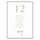 These lovely white table seating card feature a lovely watercolor blue ribbon and faux gold font. The design includes 10 guests per table, but design can allow for up to 12 guests max. The design is repeated at the back for easy visibility from all sides of the table. Add each sign with individual seating number to cart.