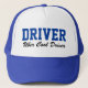 Blue and white trucker hat for the uber cool ride share driver to wear while on duty and performing chauffering and personal car delivery and courier services. Makes your appearance a little more professional while driving the urban city streets.