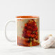 Against the backdrop of a lone maple in a hillside, bright orange and yellow autumn leaves float on the breeze.