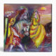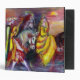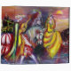 Elegant ,whimsical,artistic painting with magic colorful musical nocturne,moon,faeries,horses in vibrant blue green,red,yellow,white colors .Acrylic painting on canvas, mixed media painting with golden and silver foil .