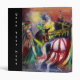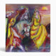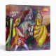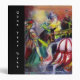 Elegant ,whimsical,artistic painting with magic colorful musical nocturne,moon,faeries,horses in vibrant blue green,red,yellow,white colors .Acrylic painting on canvas, mixed media painting with golden and silver foil .