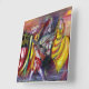 Elegant ,whimsical,artistic painting with magic colorful musical nocturne,moon,faeries,horses in vibrant teal blue green,red,yellow,white colors .Acrylic painting on canvas, mixed media painting with golden and silver foil .