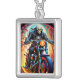 a skeleton gripped in pandemonium bike. Riding through the intertwining branches on the trail .He had a hopped-up .He has a black leather trousers and motorcycle boots And a black leather jacket with bone like design on the bilker outfit .With the sun going down behind him. Haze rising up from around him into the dark night he rids away with night stars above.