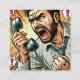 A gripping comic-style close-up of a nervous man yelling into a telephone, sweat trickling down his forehead. The exaggerated features and bold lines amplify his urgency, making it a striking image for a calling card design.