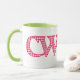 A fun Ringer Mug with a Green lip and handle and the Welsh word 'cwtch', meaning 'cuddle' or 'hug', in a Celtic script, filled with a bright Red and White Check Gingham pattern.
