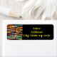 These address labels have a mid-century modern design of triangles and rings in retro colors on a field of black.