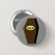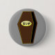 This button features a creepy coffin made from wood with gold edging. The coffin lid is slightly open revealing only darkness within. The gold plaque on the front of the coffin has spooky black text on it that says RIP, giving no clue who or what might be lurking inside. This fun yet sinister coffin is ideal for Halloween. The bleak grey background acts to draw the eye of the observer towards the coffin of doom.