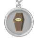 This beautiful necklace features a creepy coffin made from wood with gold edging. The coffin lid is slightly open revealing only darkness within. The gold plaque on the front of the coffin has spooky black text on it that says RIP, giving no clue who or what might be lurking inside. This fun yet sinister coffin is ideal for Halloween. The bleak grey background acts to draw the eye of the observer towards the coffin of doom.
