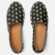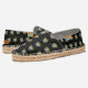 This awesome pair of espadrilles features a grey tombstone with RIP in dripping black text on it, standing on a patch of green grass. Befitting of this morbid design the background is black.