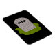 This awesome magnet features a grey tombstone with RIP in dripping black text on it, standing on a patch of green grass. Befitting of this morbid design the background is black.