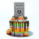 Festive gray black and white RIP tombstone with Skull Halloween large 3 x 6 cake pick; for halloween party favors or halloween dessert table decor. Ornaments have a "Dia de los muertos" feel.