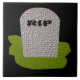 This awesome tile features a grey tombstone with RIP in dripping black text on it, standing on a patch of green grass. Befitting of this morbid design the background is black.