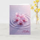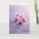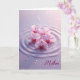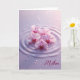 This design shows five pale pink blossoms with rich magenta centers, arranged as if they’re gently floating on a glossy, still surface where soft circular ripples spread outward. The light is diffused and silky, catching the curved petals and the wavelets in a way that feels like a quiet, affectionate pause between close friends ❤️. Lavender, blush pink, and muted purple tones blend together across the background, keeping the scene calm and tender without feeling flat. Tiny sparkles scattered on the surface resemble dew or little flecks of light, adding a soft, romantic shimmer as though the flowers are being admired in silence. In the lower-right area, the word “Mother” appears in a flowing, calligraphic style, set in a dark purple shade that stands out against the pale surface. The lettering sits just above the edge, leaving plenty of open space so the flowers remain the focus 🌼. Each blossom has gently shaded petals, and the concentric ripples are faint but visible, widening in smooth rings around the arrangement.