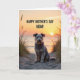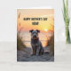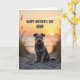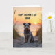 This card features a shaggy-coated dog centered on a rippled sandy path, looking straight ahead with gentle, knowing eyes that feel like a loyal friend’s steady gaze ❤️. Its textured fur mixes grizzled grays with lighter strands, softly lit by warm sunset light that catches on its face and beard. Around it, thin blades of dune grass rise along the edges, lightly framing the scene like a quiet embrace. In the distance, a low sun nears the horizon over calm water, washing the sky in amber, peach, and a faint touch of lavender. A bright reflection stretches across the water toward the shore, adding a soft glow that feels like closeness shared in silence 🌼. Across the upper area, a celebratory message appears in dark, heavy lettering that stands out clearly against the bright sky. The sandy ridges beneath the dog’s paws show small shadows and highlights, giving the foreground a textured, tactile look.