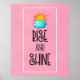 A poster with a cute typographical design. A fluffy cloud and an orange sun set on a soft pink background. Rise and Shine written in a cool trendy font.
