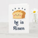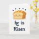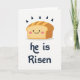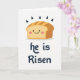 This card features a friendly, human-like loaf of bread centered on a light, airy background, drawn with a toasted golden-brown crust and a soft, pale interior. Its simple black eyes and small curved smile are paired with rosy cheeks, giving it a sweet, affectionate look that feels like a gentle nod between friends 🌷. Above the loaf, a set of dark blue triangle shapes rises in a neat stack, like rays or a quiet halo lifting upward. Below the character, the text is arranged in two lines, with “He is” placed first in a loose, flowing style and “Risen” set larger underneath for emphasis. Both lines are colored deep navy blue, standing out clearly against the pale backdrop without looking harsh. The warm beiges and browns of the bread balance nicely with the cool blue accents, while the pink blush adds a tender, caring touch 🐰. At the top, the blue triangles point upward in a tidy pattern above the smiling loaf.