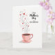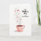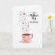 Designed with a soft blush-pink teacup at the center, this illustration shows the cup resting on a matching saucer with a gentle gray shadow beneath. Lighter pink floral patterns decorate the cup, giving it a sweet, cozy look that feels like a quiet moment shared with someone close ❤️. Inside the cup, a dark drink sends up curling, ink-like steam that turns into a trail of hearts and tiny stars, as if warm affection is rising into the air. The hearts shift from deep red to pale pink, creating a tender, romantic rhythm as they drift upward. The background stays bright white, keeping the focus on the cup and the floating shapes. Near the top, a flowing handwritten-style message appears in dark lettering, with a simpler line just below it naming who the card is for in a matching dark tone 🌼. Above the cup, the hearts and stars arc upward in a loose column, with the smallest stars sprinkled between the larger hearts.