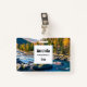Name tag with a scenic photograph featuring tree covered mountains in autumn colors. A vibrant river flows around a multitude of rocks.