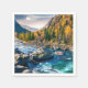 Paper napkins with a scenic photograph featuring tree covered mountains in autumn colors. A vibrant river flows around a multitude of rocks.