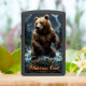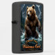 This is an epic and detailed nature graphic on a black matte lighter. It features a powerful brown grizzly bear standing mid-splash in a rushing river, surrounded by dark green pine forests and misty, snow-capped mountains. The bear is prominently centered, framed by an ornate dark gothic border. The customizable name "Theodore" and the phrase "Wilderness Creed" are boldly displayed at the base in glowing gold and orange. This design features is a highest quality print.